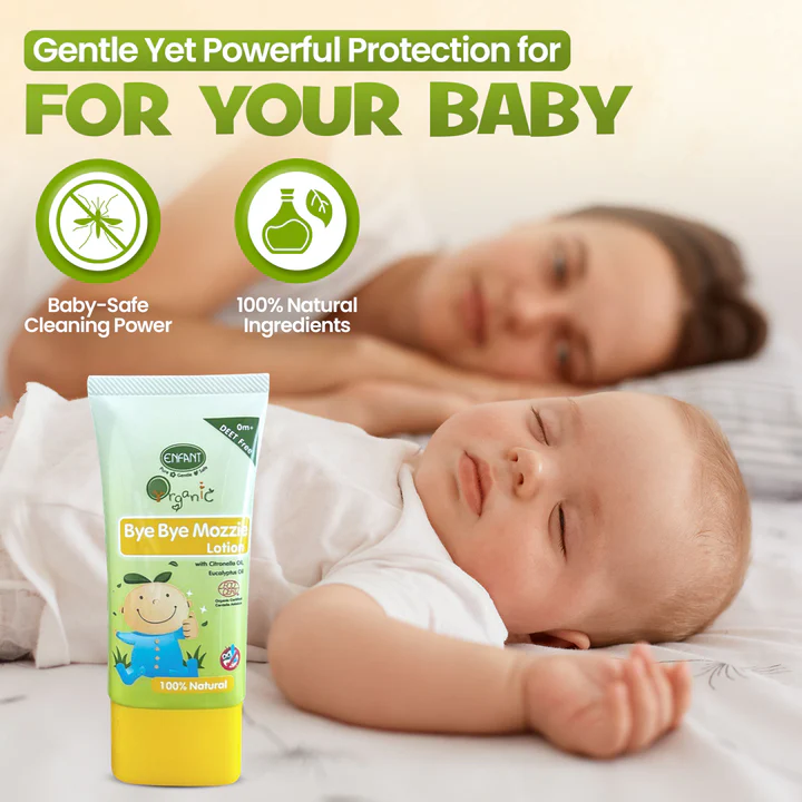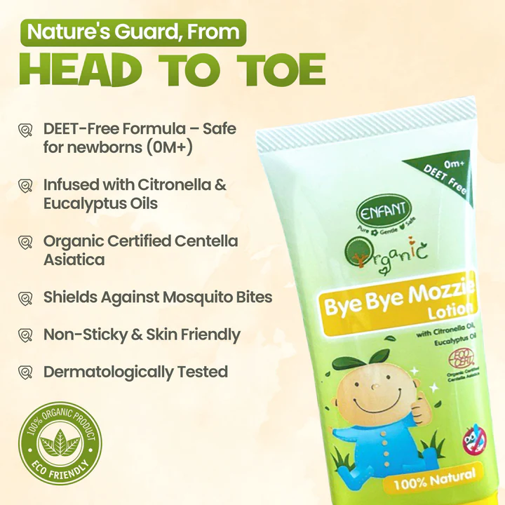 Keep your little ones protected with ENFANT Organic Bye Bye Insect Repellent Lotion, a safe and effective solution specially formulated for babies and kids. Designed with care using 100% organic and natural ingredients, this mosquito repellent lotion provides gentle, chemical-free protection against mosquitoes and bugs — ideal for families in warm, humid climates like the UAE and Oman.