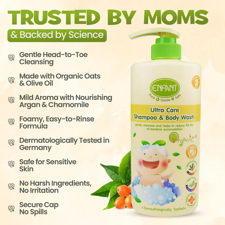 Gently cleanses and helps to reduce 99.9% of bacteria accumulation Confidently cleanses your baby with natural antibacterial formula. Specially designed for your baby with OAT AMINO BUBBLE, a natural cleansing agent. Enriched with Triple Organic Essence from Avocado Oil, Sea Buckthorn Oil and Olive Oil to moisturize skin and hair. Infused with the natural antibacterial from Tea Tree Oil.