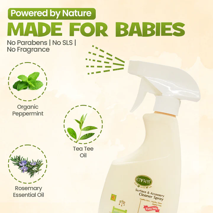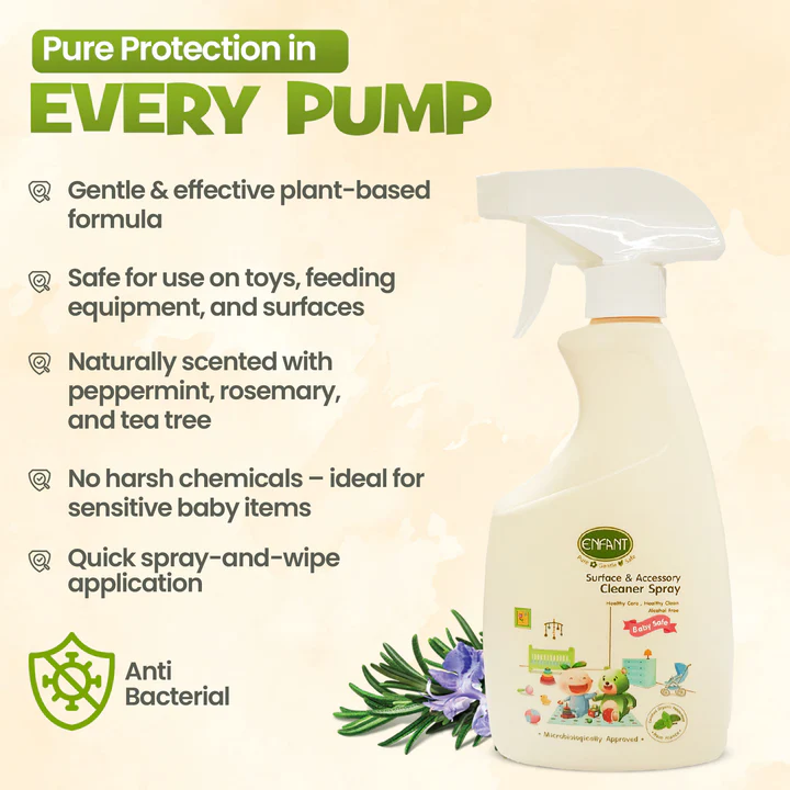 Looking for a safe and effective cleaner spray to keep your baby’s surroundings hygienic? The ENFANT Surface & Accessory Cleaner Spray is specially formulated to clean baby accessories, toys, feeding equipment, and high-contact surfaces. Ideal for parents in UAE, Oman, Saudi Arabia, and Qatar, this spray ensures your little one’s environment remains fresh, clean, and germ-free.