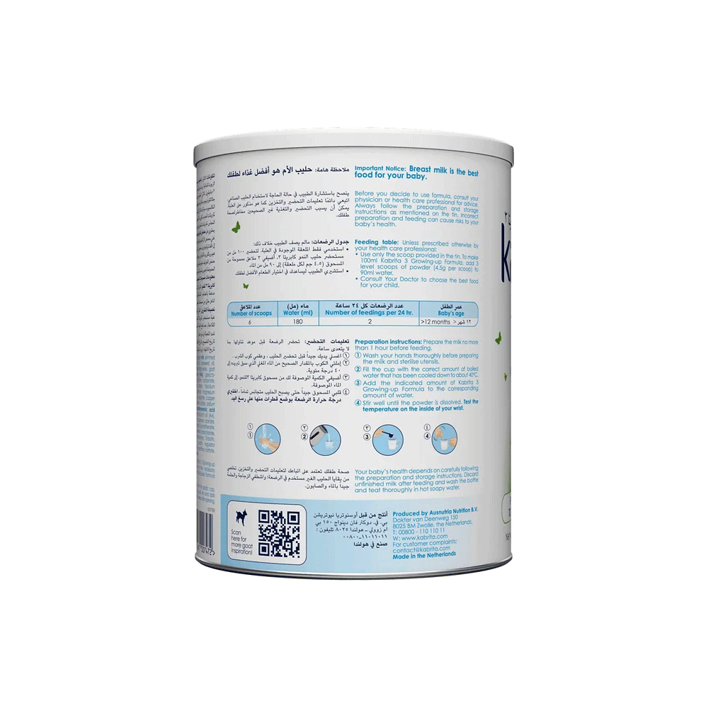 Unless prescribed otherwise by your health care professional: use only the scoop provided in the tin. To make 100ml kabrita infant milk: add 3 level scoops of powder (13,2g), to 90ml water.