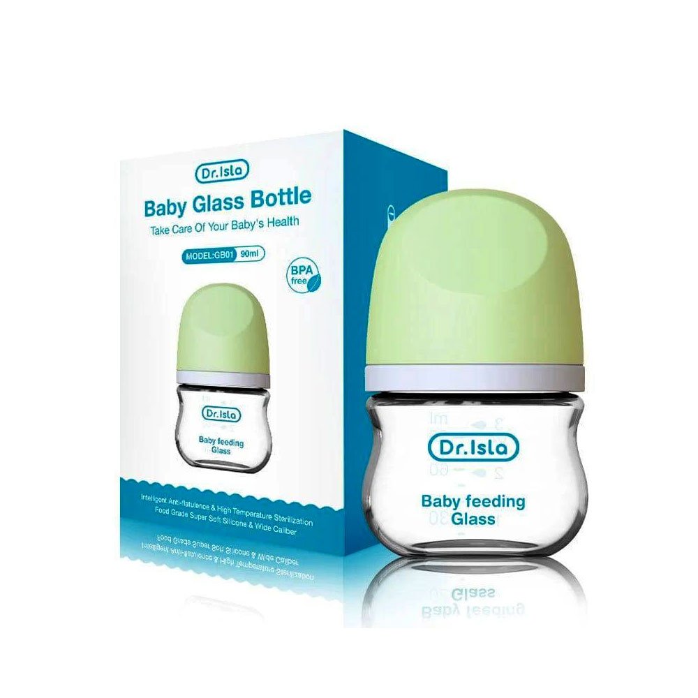The dr. Isla 90 ml baby glass bottle is designed for newborns and young infants, focusing on safety, comfort, and ease of use. It is typically available in both pink and green color options.