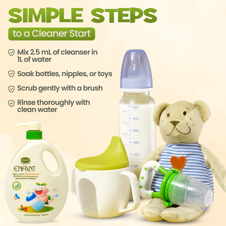 Looking for a liquid cleaner that’s gentle, effective, and safe for your baby’s daily essentials? The ENFANT Organic Nipple & Bottle Cleaner is a premium plant-based cleaning solution specially designed for washing baby bottles, nipples, pacifiers, toys, and accessories. Formulated with Organic Tea Tree Oil and a double-action cleanser system, it offers powerful antibacterial properties while being kind to delicate skin.