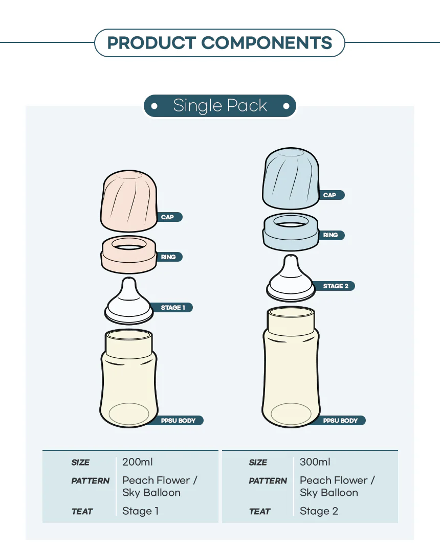 • 200 ml bottle: Comes with Grosmimi The Easy Teat – Stage 1 (1–3 months)