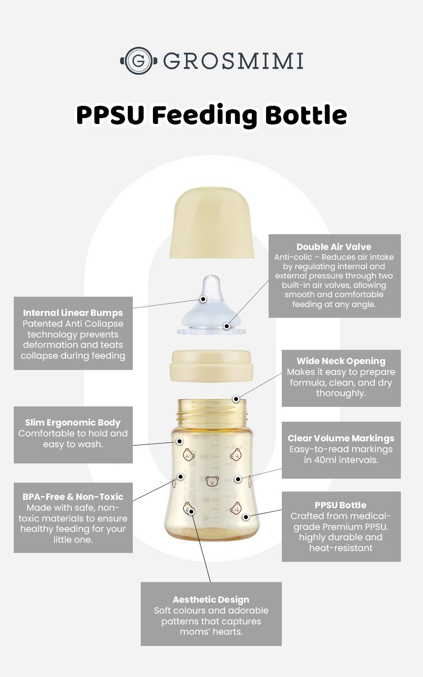 Grosmimi feeding bottles are made from PPSU, a material commonly used in medical devices that require repeated steam sterilization. The bottle is highly durableheat-resistantBPA-free, and microwave safe.